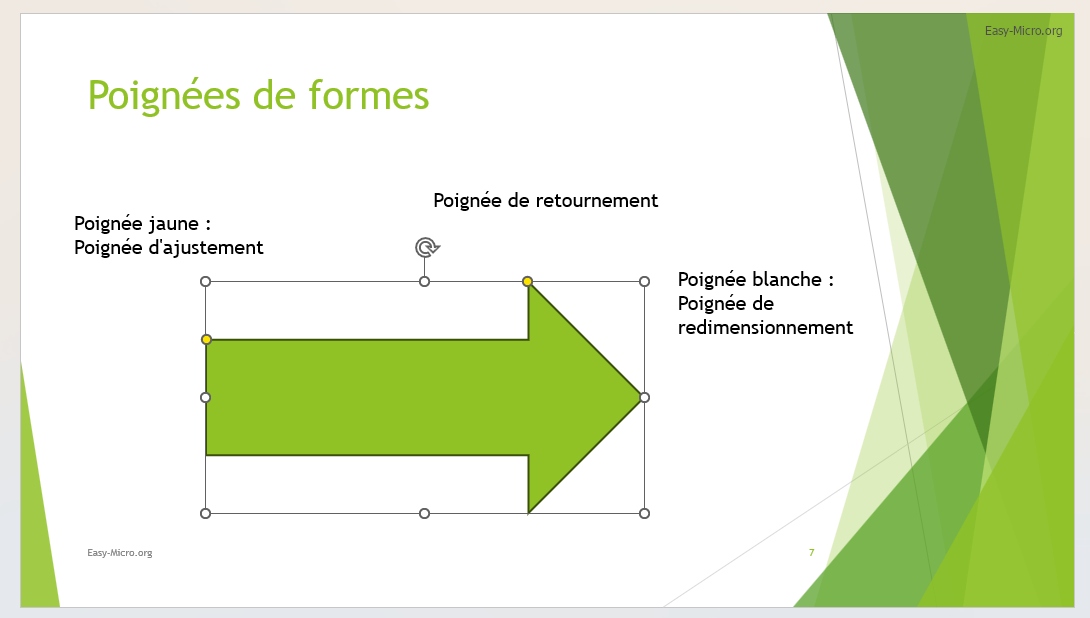Il existe différentes poignées de formes : les poignées blanches (de redimensionnement), les poignées jaune (d'ajustement) et la poignée de retournement