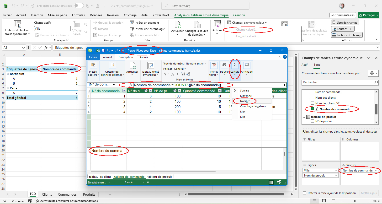 Comme on peut le voir, les champs calculés ne fonctionne pas avec des TCD (outil grisé), mais on peut faire des calculs avec la technique des mesures. Cet exemple utilise trois tableaux structurés (Client, Commande et Produit) avec des relations. On affiche ici le nombre de commande par ville et par produit
