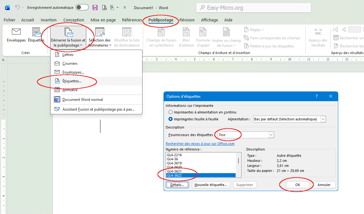 1 - Bouton "Démarrer la fusion..." : sélection du type de publipostage.