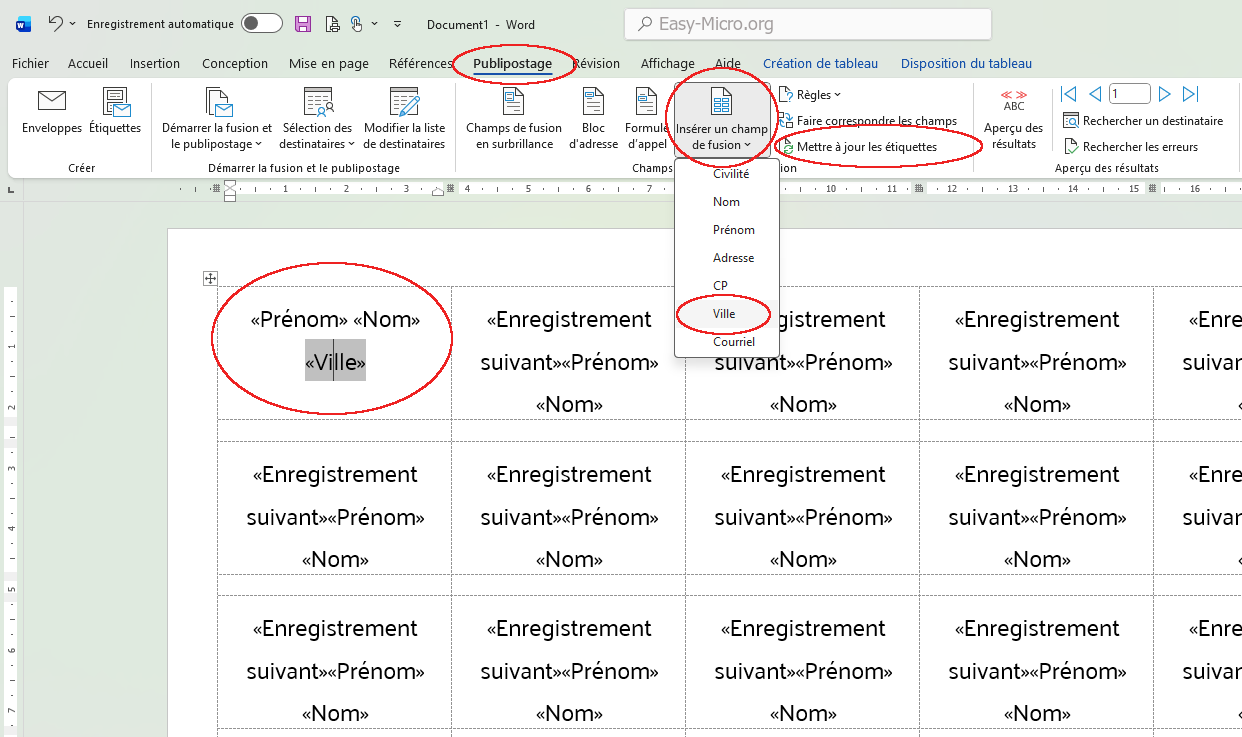 4 - Bouton "Terminer & fusionner". - Note : pour utiliser le Bloc d'adresse, utilisez d'abord le bouton "Faire correspondre les champs". Attention, Word ne fait plus disparaître les paragraphes qui ont un champ avec un enregistrement vide. La ligne est conservée malgré le vide.