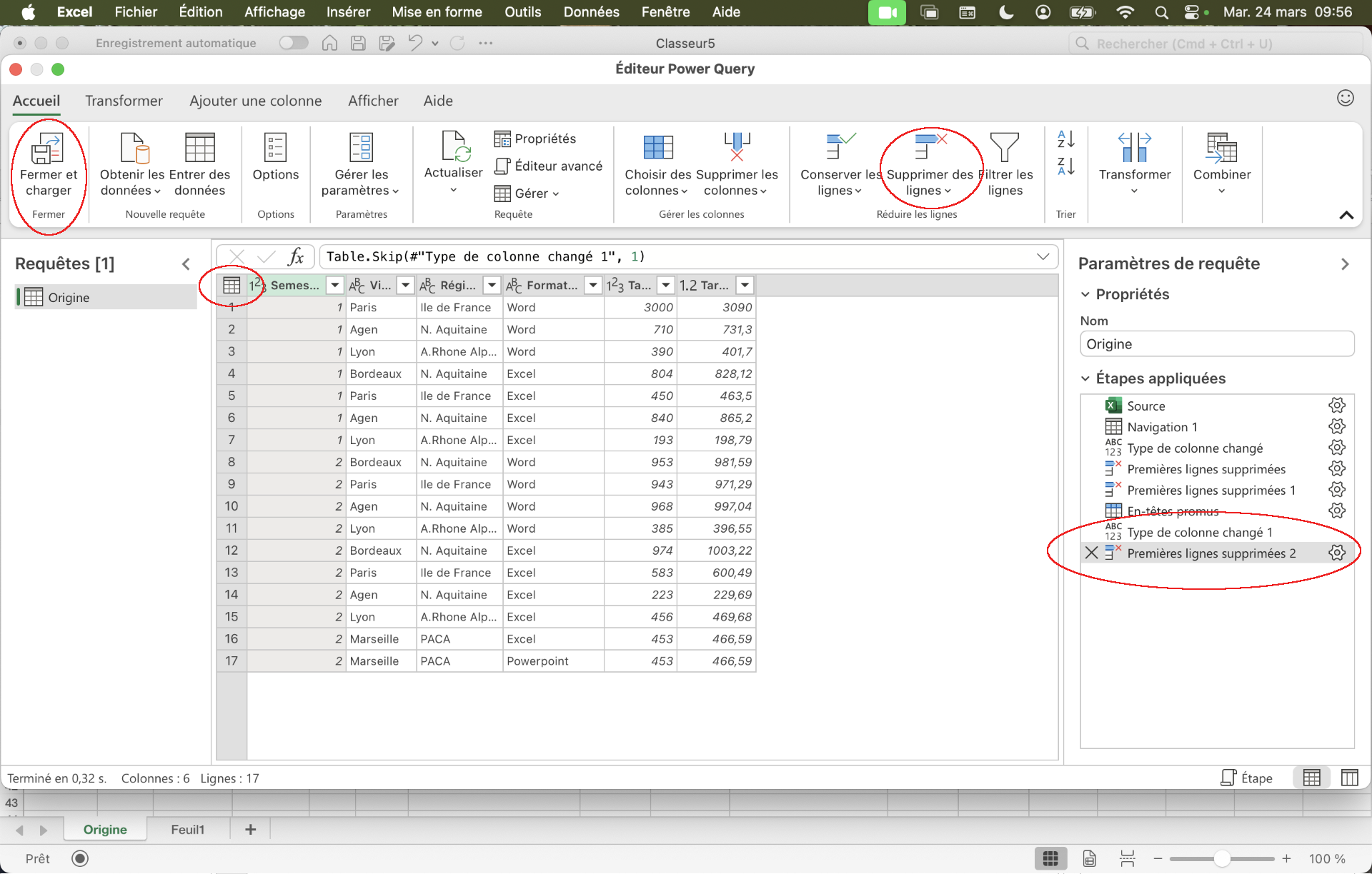 Ici, on fait le choix de supprimer les trois premières lignes du haut, de supprimer les colonnes de droite et d'utiliser la première ligne pour les en-têtes de colonnes. Ces trois étapes (modifiables) sont visibles dans le volet "Paramètres d'une requête" de gauche. On peut enfin "Fermer et charger" la requête pour ensuite la charger en tant que tableau dans Excel comme indiqué dans l'étape 3.