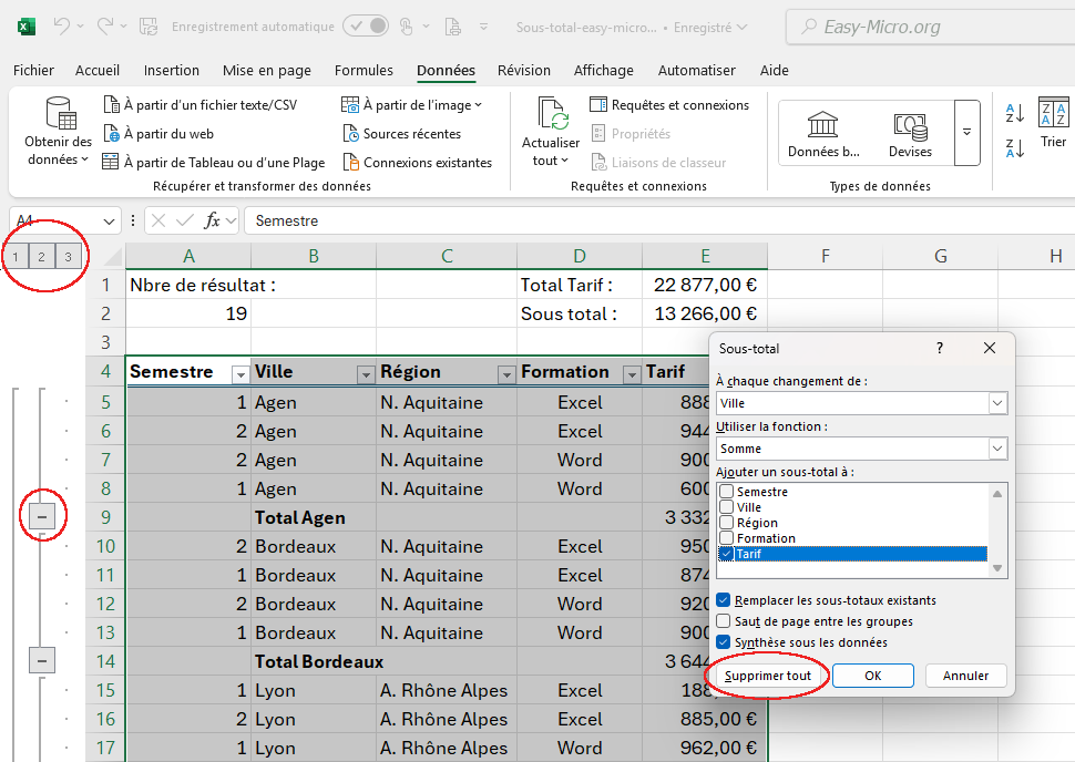 Le bouton "Supprimer tout" de la fenêtre "Sous-total" permet d'enlever les sous totaux.