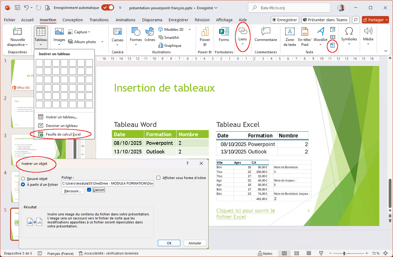 - On insère un tableau de type Excel dans Powerpoint via le bouton "Insertion d'objet" de l'onglet insertion. Ne pas oublier de côcher la case "Avec liaisons".