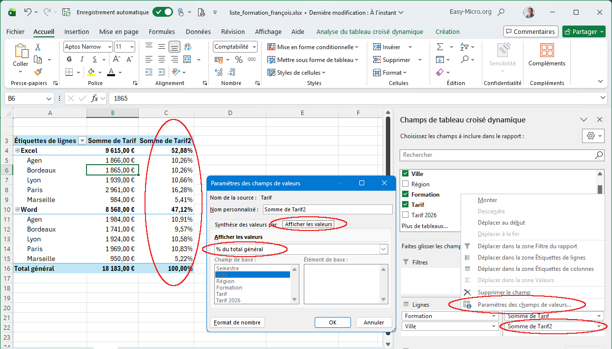 Clic de souris sur le champ "Tarif" qui se trouve dans la zone valeur. Dans la fenêtre "Paramètres de champs", onglet Afficher les valeurs, sélectionnez dans la liste déroulante "Pourcentage du total de la ligne".